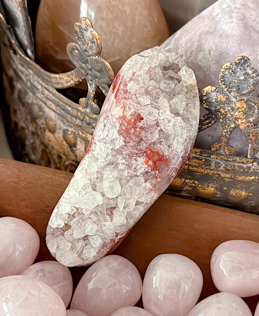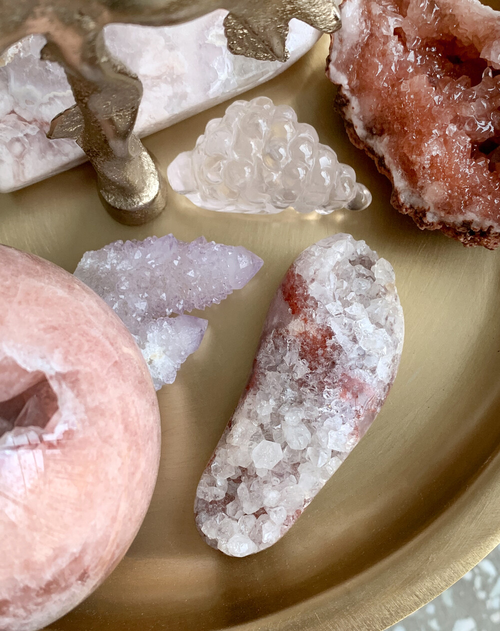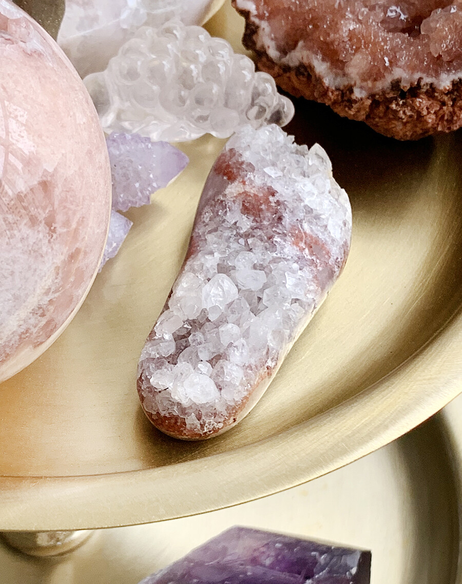윗 부분은 얼음 결정처럼 투명한 쿼츠 클러스터로 이루어져있고
